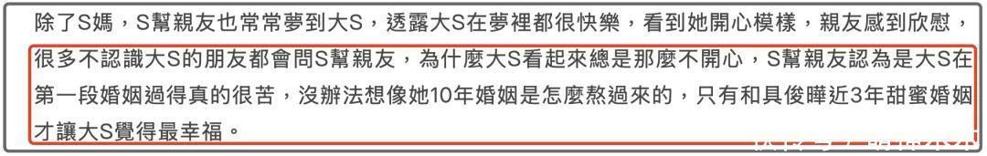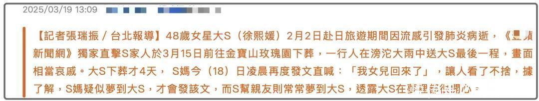 未卜先知,S妈发文后,台湾省独家媒体某果实时报说念,称是S妈梦到了大S这才发文,不仅是S妈,致使大S的其他亲一又也频繁梦到大S,还知道梦里大S很兴隆,咱即是说这家媒体仍是历害到能看到他东说念主黑甜乡了么?
