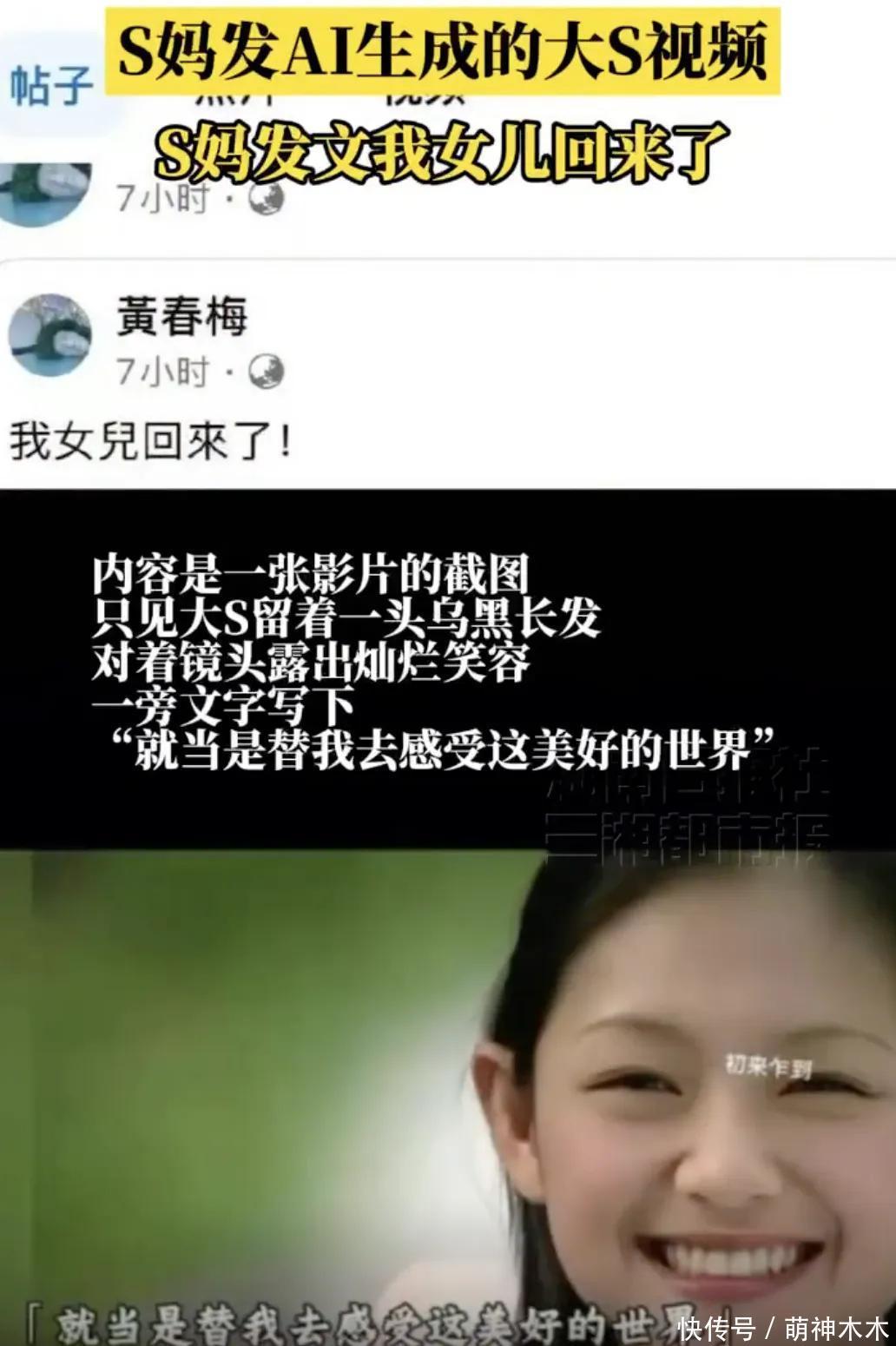 据悉,由AI生成的大S视频里,只见大S留着一头乌黑长发,对着镜头裸露灿烂笑脸,一旁笔墨写下:“就当是替我去感受这好意思好的全国”。天然该影片终点标注是“AI生成”,不外S妈如故“抚景伤情”,悲悼喊出“我儿子纪念了”、“宝贝回家”。