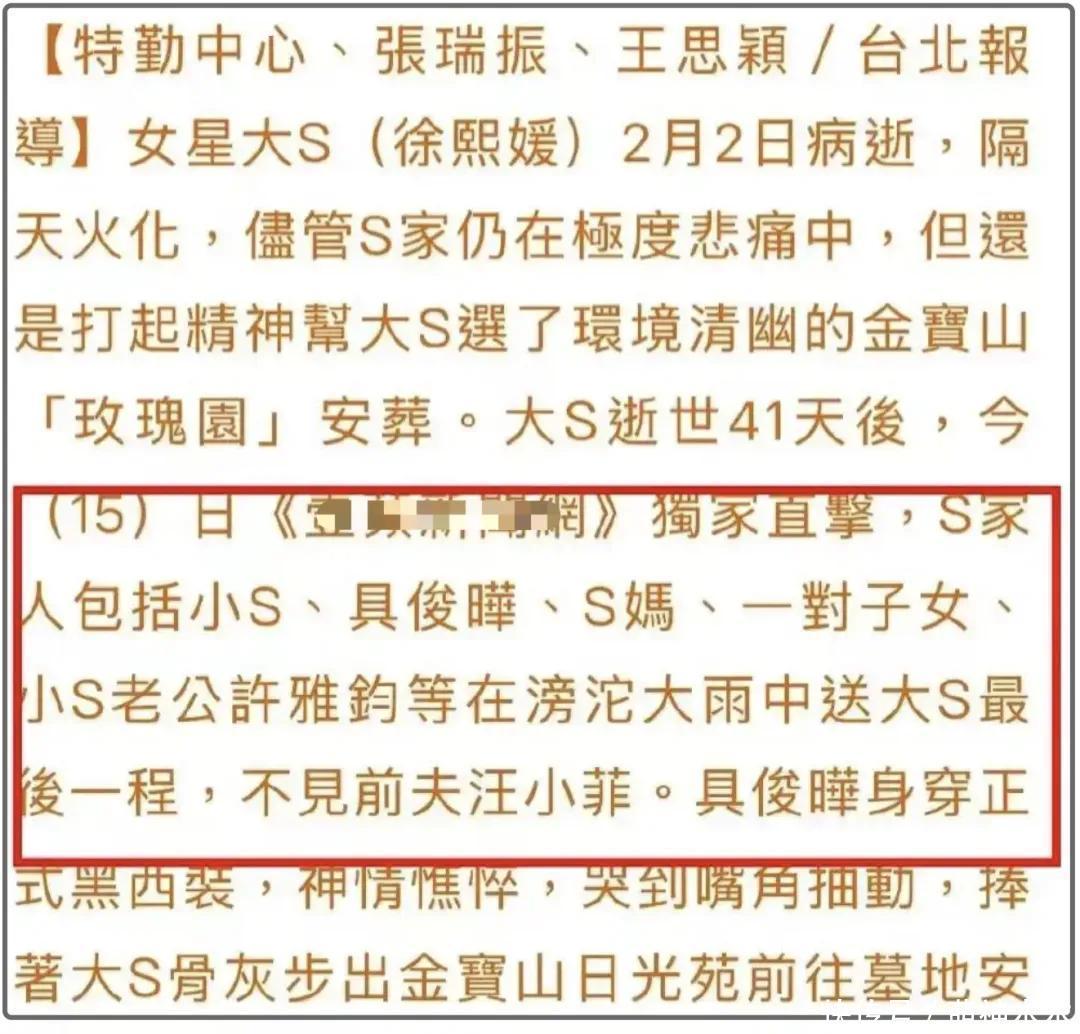 看到这里就秒懂了,居然是独家能取得S家回话的台媒。隔三差五捧具俊晔踩汪小菲,写的新闻越来越离谱。并且更离谱的是,在大S埋葬本日,这家媒体还成心报说念了说大S的两个孩子也前去坟场,和徐家东说念主一都,汪小菲莫得现身,其时还激发了不少网友盘问。